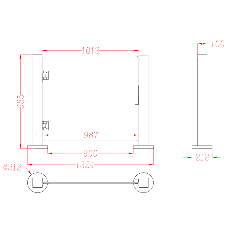| Dimensiones | Puerta: 987 (An) mm Poste: 212 (Ø) x 985 (Al) x 100 (An) mm Cerramiento completo: 985 (Al) x 1324 (An) mm |